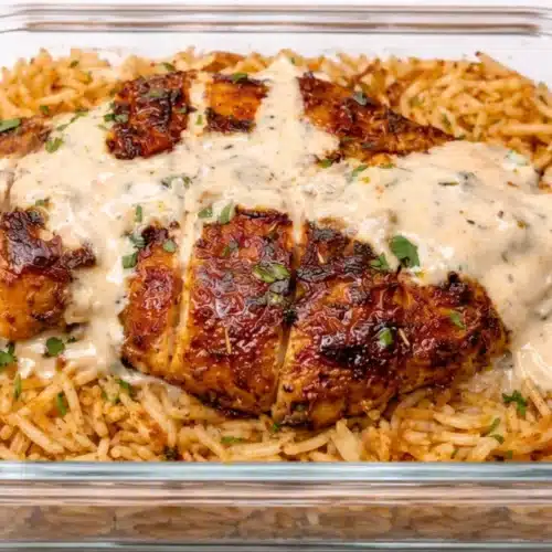 - Layer the Cajun rice on a plate, top it off with the sliced chicken, and drizzle the creamy sauce over the meal.