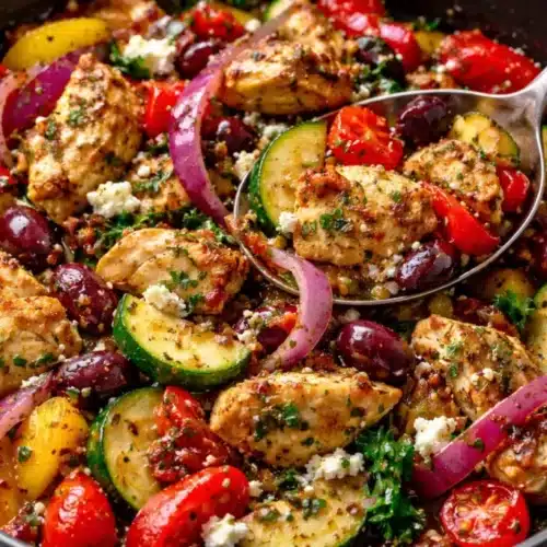 Start by preparing your ingredients. Chop the chicken into bite-sized pieces. Slice the zucchini into half-moons, and dice the red bell peppers into chunks. Slice the red onion and halve the cherry tomatoes. Don’t forget to pit and halve the Kalamata olives, and mince the garlic. Lastly, chop the sun-dried tomatoes. This preparation will make your cooking process smooth and efficient.